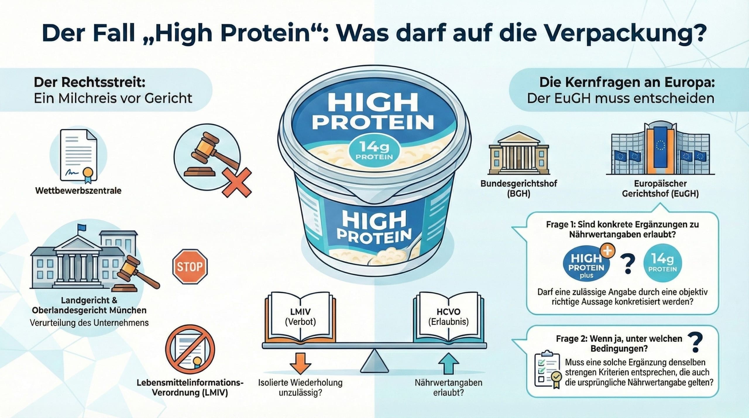 Der Beschluss betraf die rechtliche Zulässigkeit der gleichzeitigen Verwendung der nährwertbezogenen Angabe „HIGH PROTEIN“ und der konkreten Gramm-Angabe „14G PROTEIN“ auf einer Milchreis-Verpackung. Der BGH hat das Verfahren ausgesetzt und dem Gerichtshof der Europäischen Union (EuGH) Fragen zur Auslegung der Health-Claims-Verordnung (HCVO) und der Lebensmittelinformationsverordnung (LMIV) vorgelegt. Es geht zentral um die Frage, ob die Gramm-Angabe als zulässige Konkretisierung der nährwertbezogenen Angabe gelten kann, obwohl sie in der LMIV nicht zur Wiederholung vorgesehen ist.